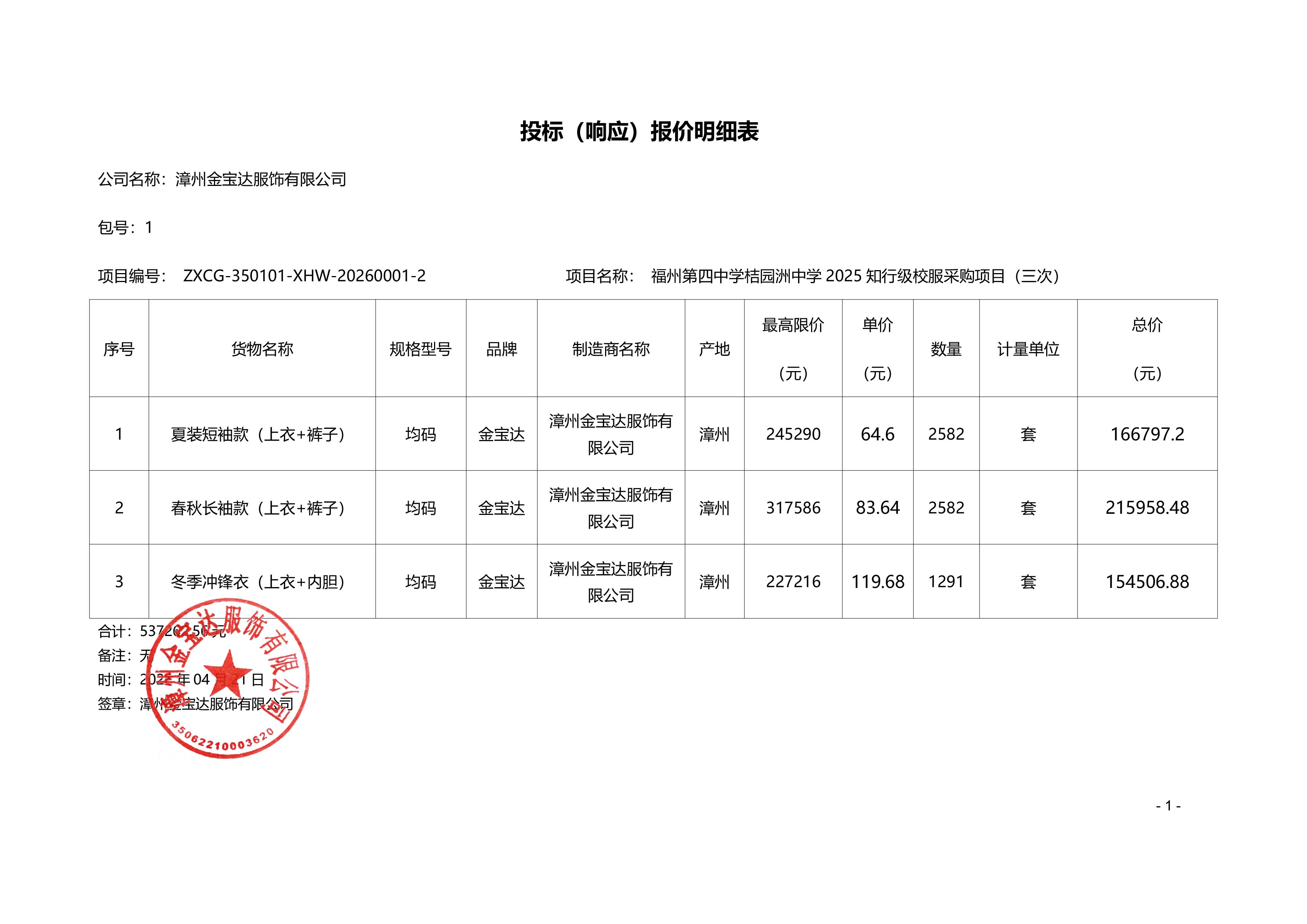 | 1-1 | 普通服装 | 福州第四中学桔园洲中学2025知行级校服采购 | 金宝达 | 均码 | 1 | 批 | 537,262.5600 | 537,262.56 |